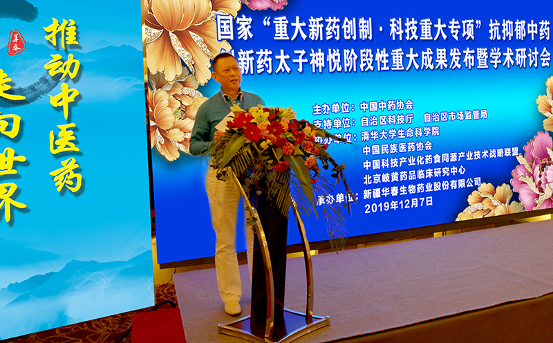 新疆自治區衛生健康委黨組成員、副主任周美林在講話中說:自治區黨委、政府也高度重視中醫藥工作,陳全國書記對貫徹落實《中共中央 國務院關于促進中醫藥傳承創新發展的意見》和全國中醫藥大會精神作出了重要指示,進行了安排部署,我委按照自治區黨委政府要求也在為召開自治區中醫藥大會進行積極籌備。通過多年艱辛努力,由清華大學、新疆華春生物藥業股份有限公司共同研發的抗抑郁中藥創新藥“太子神悅膠囊”,是自治區獲得“十三五”國家重大新藥創制科技重大專項的中藥創新成果,其取得的階段性重大成果、擁有的自主知識產權,必將對推動自治區中醫藥科技創新和現代化發產生重大意義。本次科技成果發布會,將是對我們新疆本土藥企中醫藥自主創新能力和科研實力的一次全面展示;同時通過學術研討,也為來自國內中醫藥專家學者針對精神性疾病領域的中醫藥科研成果進行深入交流提供了難得的交流機會和平臺,將對促進我區精神性疾病中醫藥診療、新藥研發進步發揮重要的作用。