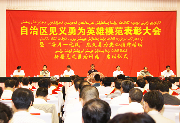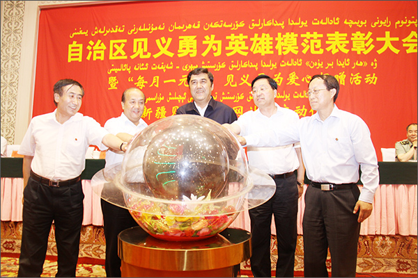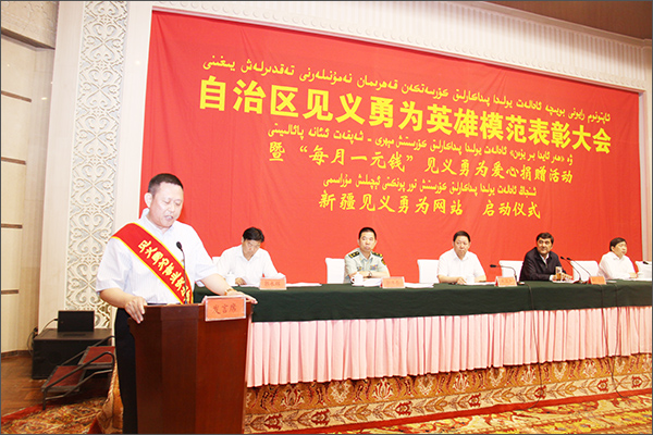“總有一種力量讓我們熱淚盈眶,總有一種精神讓我們格外振奮!總有一種感動讓我們持久難忘。”自治區(qū)黨委副書記、自治區(qū)主席、自治區(qū)綜治委主任努爾•白克力出席解讀了此次表彰大會的深層涵義:通過弘揚(yáng)見義勇為精神,激發(fā)人民群眾共建平安,引領(lǐng)積極向上的社會風(fēng)尚,就是把中華民族的核心精神和優(yōu)秀文化發(fā)揚(yáng)光大。就會為凝聚民族合力,推進(jìn)中華民族偉大復(fù)興的“中國夢”,全面建成小康社會創(chuàng)造有利條件。努爾•白克力說:今天受表彰的3名見義勇為英雄、2個(gè)見義勇為英雄群體和13個(gè)為自治區(qū)見義勇為事業(yè)作出突出貢獻(xiàn)的模范單位、個(gè)人就是他們中的杰出代表。他們是新疆各族人民群眾的優(yōu)秀兒女,是我們時(shí)代的百姓英雄和社會楷模!